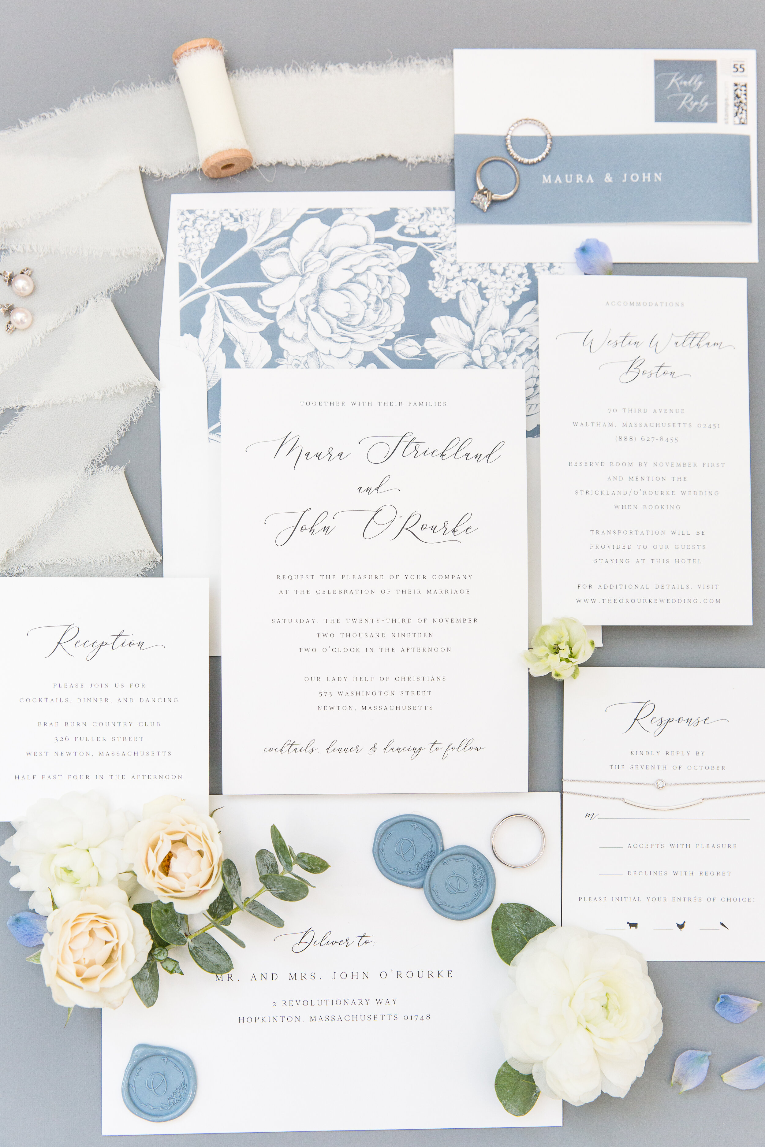 On the morning of November 23, 2019, our team attended to some final details, like styling this gorgeous wedding invitation suite for Maria Burton Photography. Meanwhile, Maura + John got ready in the Bridal and Groom suites, on opposite sides of the Country Club. I just loved the grand staircase. It provided a beautiful setting that was perfect for pictures.